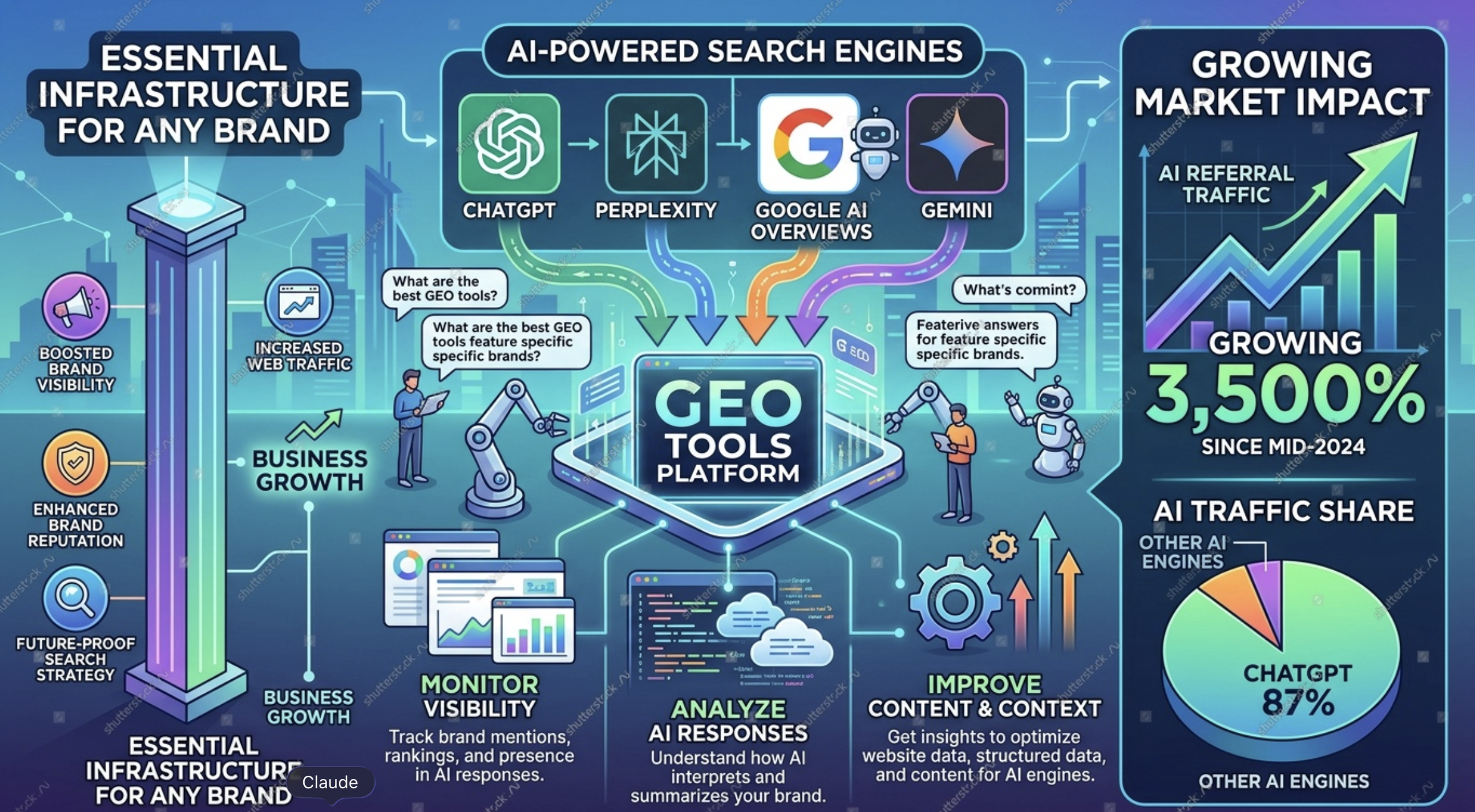 Generative engine optimization (GEO) tools are platforms that monitor and improve your brand's visibility in AI-powered search engines like ChatGPT, Perplexity, Google AI Overviews, and Gemini. With AI referral traffic growing 3,500% since mid-2024 and ChatGPT now controlling 87% of that traffic, GEO tools have moved from nice-to-have to essential infrastructure for any brand that depends on search visibility.