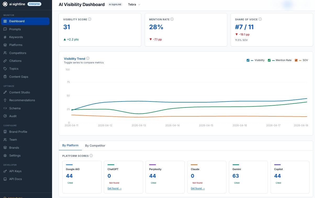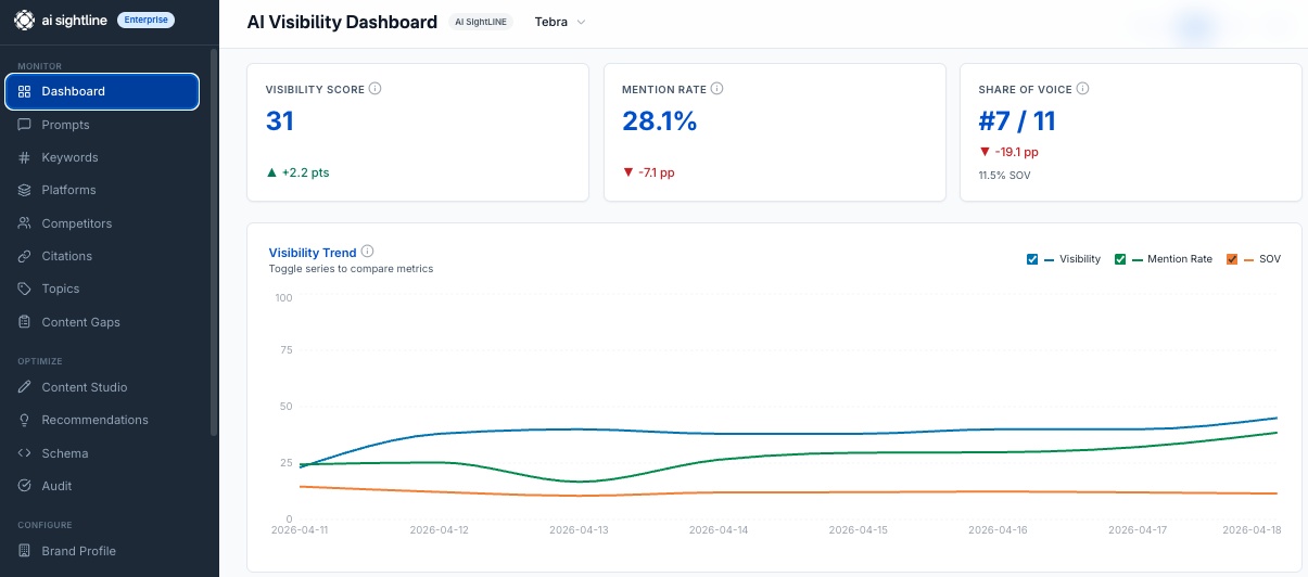AI Sightline tracks your visibility score, citation count, mention frequency, and competitor comparisons across up to 6 AI platforms on a daily scan cycle. When you make changes to your content, schema, or publishing strategy, you can see the impact reflected in your next scan results.