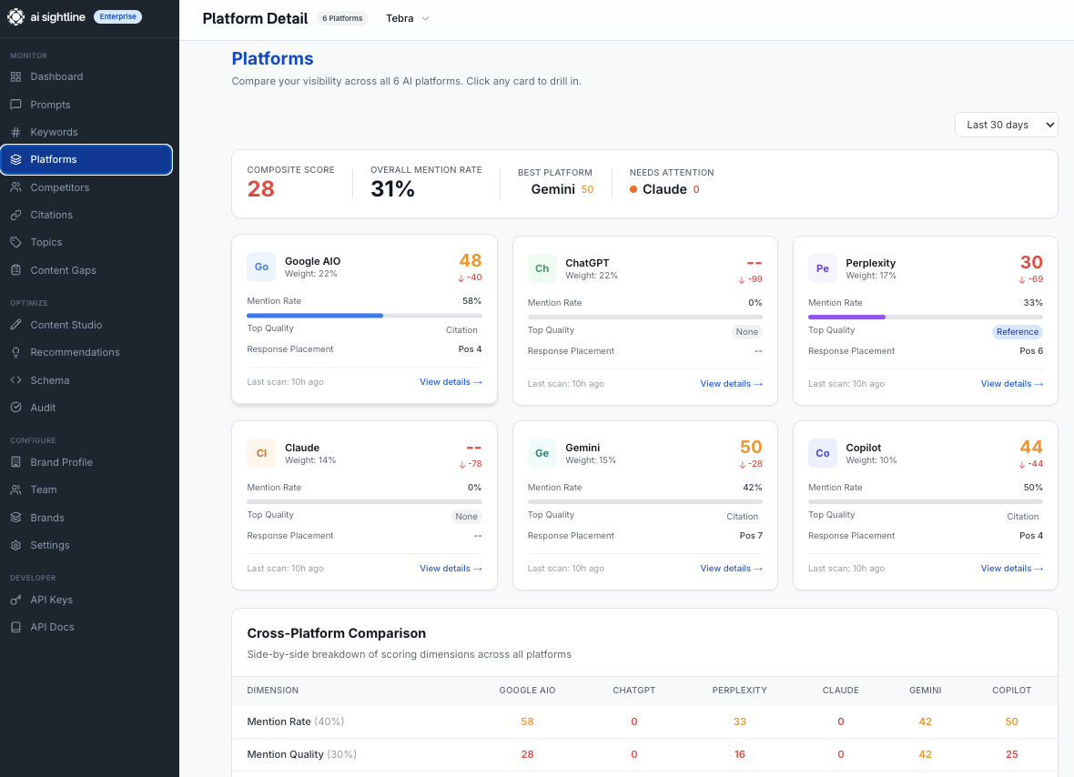 Platform coverage. Minimum 4 of the 6 major AI surfaces: Google AI Overviews, ChatGPT, Perplexity, Claude, Gemini, and Copilot.