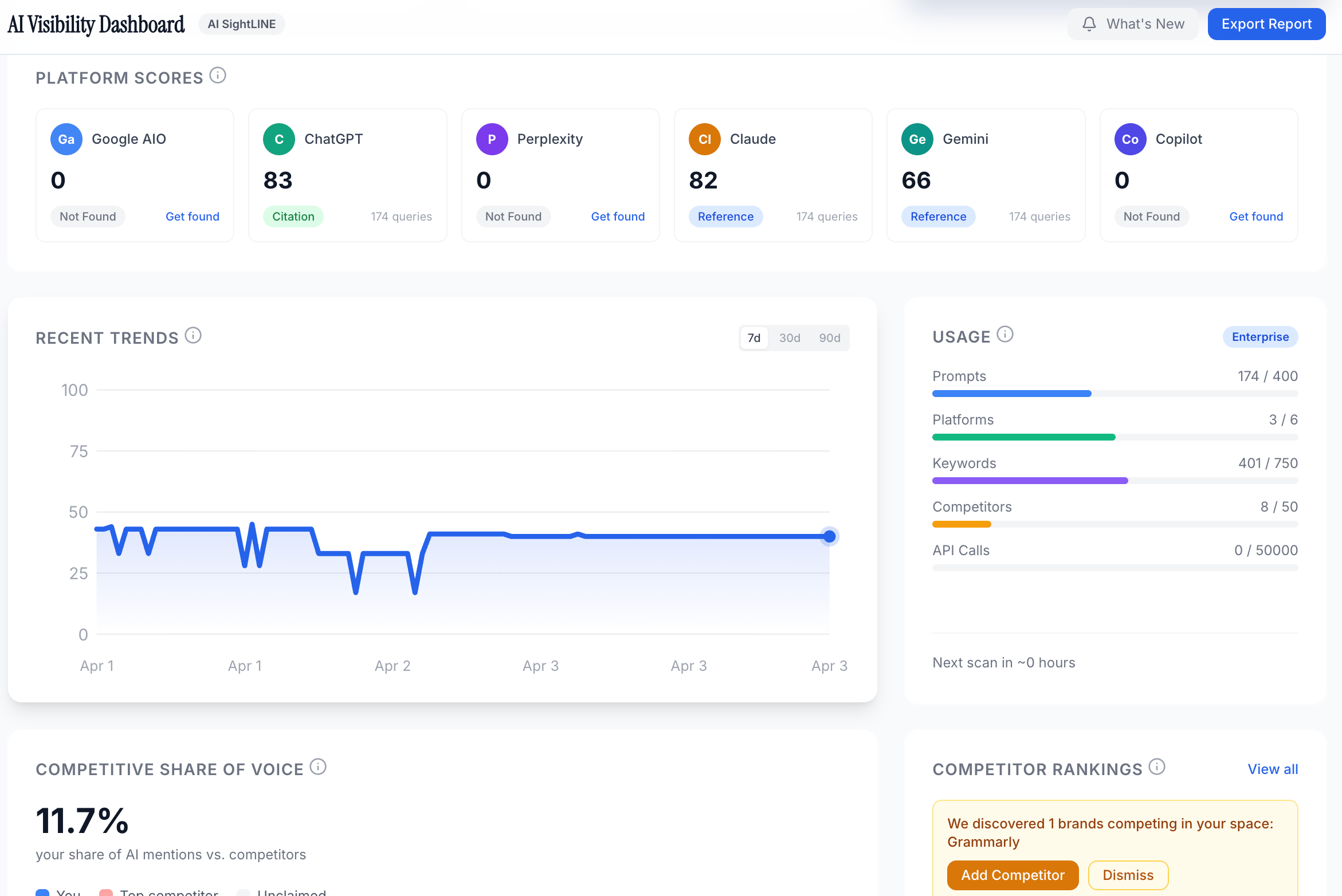 Because scans run automatically on a rolling cycle, AI Sightline tracks how your keyword mentions change over time. Did you publish a new piece of content and see your brand keyword appear in more AI responses the following week? Did a competitor launch a product and suddenly start appearing in prompts where they were previously absent? The trend data connects your actions to visibility outcomes.