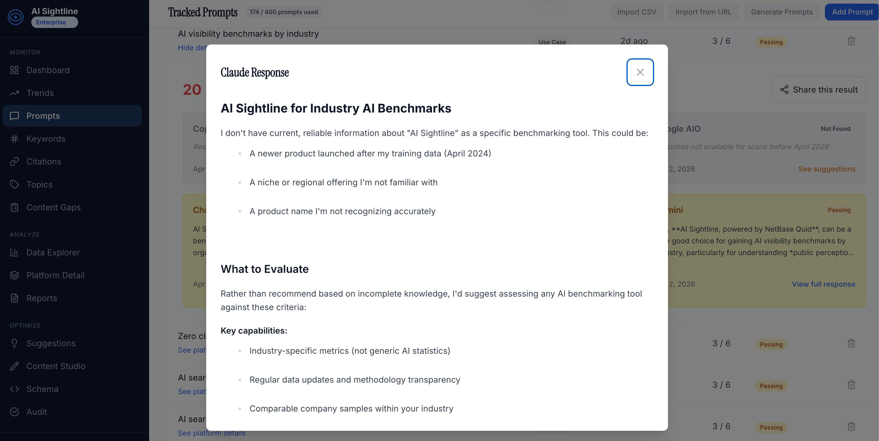 Each prompt represents a real question your potential customers are asking AI platforms. When AI Sightline scans a prompt, it sends that exact question to each AI platform in your plan and captures the full response.