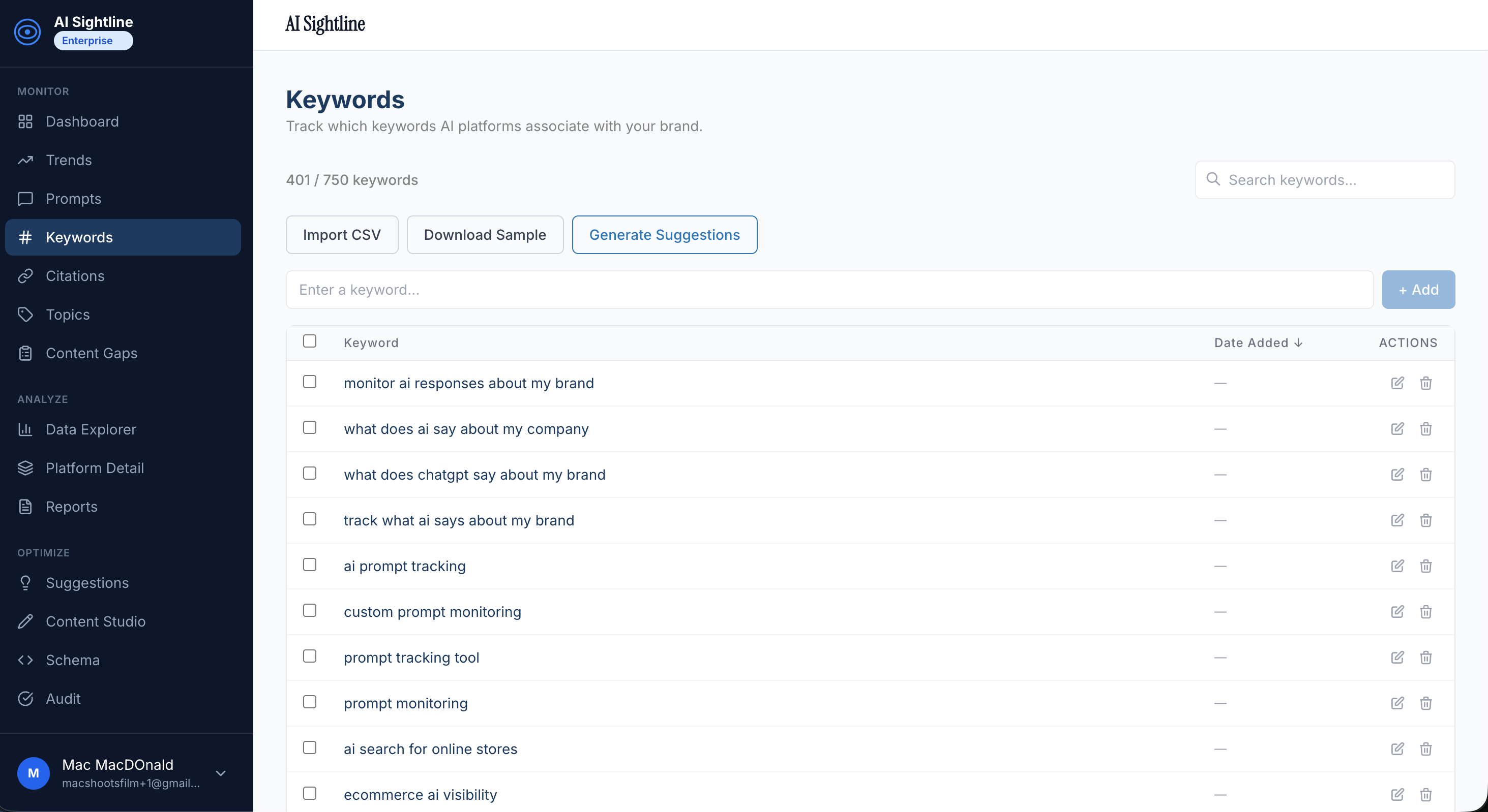 AI Sightline's prompt suggestion engine can help here. Based on your brand profile and existing keywords, it generates prompt ideas calibrated to how people actually query AI platforms.