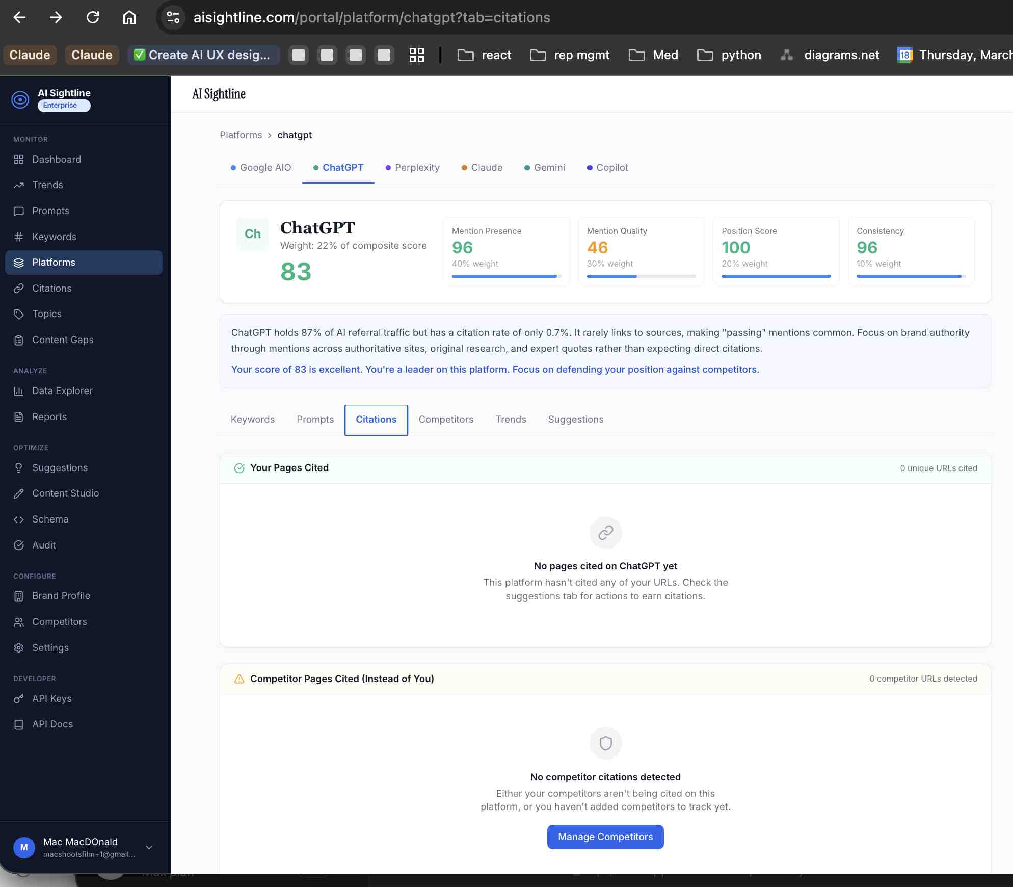 AI Sightline's visibility score is a 0-100 composite that factors in mention presence, citation quality, position, and consistency across 6 AI platforms. Content audit scores, which include schema completeness, directly influence what our suggestions engine recommends as your highest-priority improvements.